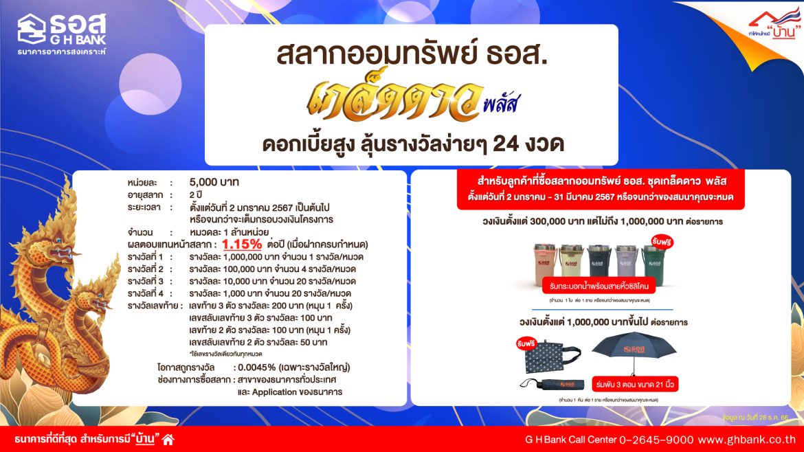 ธนาคารอาคารสงเคราะห์ (ธอส.) มอบโชคต้อนรับปีใหม่ 2567 ให้กับผู้รักการออมที่ต้องการทางเลือกในการออมเงินที่ให้ผลตอบแทนหน้าสลากเพิ่มสูงขึ้น มีโอกาสถูกรางวัลใหญ่ กับ “สลากออมทรัพย์ ชุดเกล็ดดาว พลัส” หน่วยละ 5,000 บาท อายุสลาก 2 ปี ซื้อสลากตั้งแต่วันที่ 2 มกราคม 2567 เป็นต้นไปรับผลตอบแทนหน้าสลากสูงถึง 1.15% ต่อปี เมื่อฝากครบกำหนดจะได้รับเงินต้นพร้อมดอกเบี้ยรวมหน่วยละ 5,115 บาท และมีสิทธิ์ลุ้นรางวัลทุกเดือนรวม 24 ครั้ง