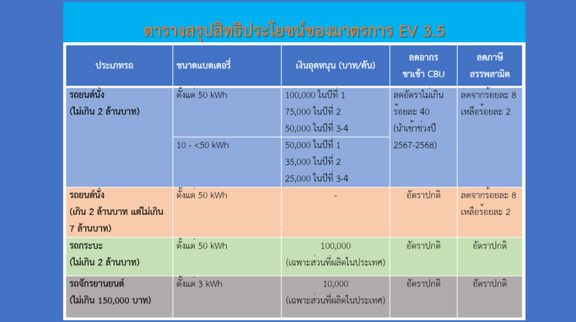 สำหรับมาตรการ EV 3.5 จะมีผลใช้บังคับในช่วงปี 2567 – 2570 โดยครอบคลุมทั้งรถยนต์ไฟฟ้า รถกระบะไฟฟ้า และรถจักรยานยนต์ไฟฟ้า โดยสิทธิประโยชน์ประกอบด้วย 3 ส่วน คือ เงินอุดหนุน การลดอัตราอากรขาเข้ารถยนต์สำเร็จรูป และการลดอัตราภาษีสรรพสามิต โดยเงินอุดหนุนจะเป็นไปตามประเภทของรถ และขนาดของแบตเตอรี่ ดังนี้