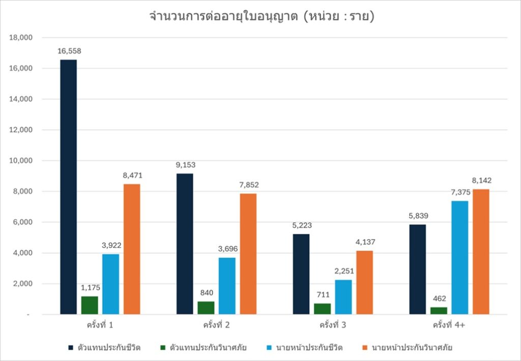 โดยการต่ออายุครั้งแรกมีจำนวนมากที่สุดกว่า 30,126 ราย สะท้อนให้เห็นว่าอาชีพตัวแทน-นายหน้ามีความเป็นอิสระและยังได้รับความสนใจอย่างมาก เป็นช่องทางหลักที่นำเสนอผลิตภัณฑ์ประกันภัยไปสู่ประชาชน ผ่านตัวเลขการเข้าสู่วิชาชีพอย่างต่อเนื่อง ขณะเดียวกันยังพบว่ามีผู้ประกอบวิชาชีพจำนวนมากยังคงยืนหยัดอยู่ในตลาดประกันภัยระยะยาว