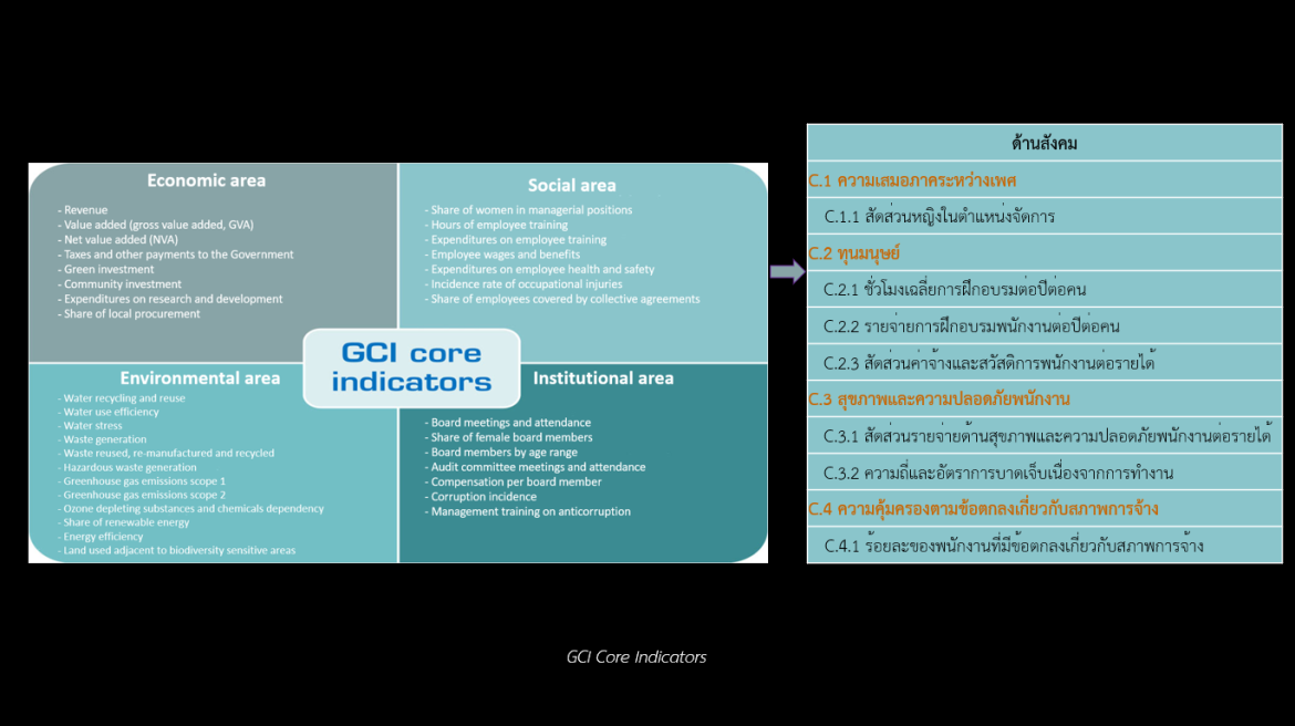 มาต่อกันที่ “ตัววัดด้านสังคม” เป็นส่วนหนึ่งใน GCI (Guidance on Core Indicators for Sustainability and SDG Impact Reporting) ซึ่งเป็นชุดตัวชี้วัด 4 ด้าน คือ ด้านเศรษฐกิจ ด้านสิ่งแวดล้อม ด้านสังคม และด้านสถาบัน เพื่อใช้เป็นจุดตั้งต้นหรือจุดนำเข้าในการรายงานผลการดำเนินงานที่ตอบสนองต่อ SDG