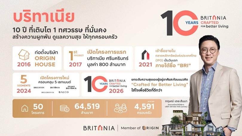 คุณกฤษณ์ เตชะสัมมา ประธานเจ้าหน้าที่บริหาร บริษัท บริทาเนีย จำกัด (มหาชน) เล่าย้อนกลับไปเมื่อ 10 ปีก่อน ราวปี 2559 ว่า บริทาเนีย เปรียบเสมือนเหมือน New S-Curve ให้กับบริษัทแม่ คือ บริษัท ออริจิ้น พร็อพเพอร์ตี้ จำกัด (มหาชน) หรือ ORI ผู้พัฒนาคอนโดมิเนียมเป็นสินค้าหลัก ที่มีความต้องการจะขยายธุรกิจสู่ที่อยู่อาศัยแนวราบ (บ้านจัดสรร) ภายใต้บริษัท ออริจิ้น เฮ้าส์ จำกัด ด้วยทุนจดทะเบียน 1 ล้านบาท