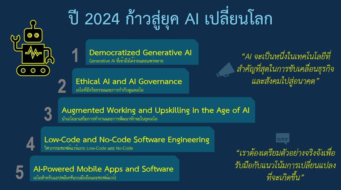ด้วยเหตุนี้ในสัปดาห์นี้ ผมจึงขอเน้นเจาะลึกแนวโน้มของเอไอในปี 2024 ที่ผมเชื่อว่าจะเป็นหนึ่งในเทคโนโลยีที่สำคัญที่สุดในการขับเคลื่อนธุรกิจและสังคมไปสู่อนาคต โดยจะครอบคลุม 5 ประเด็นดังต่อไปนี้