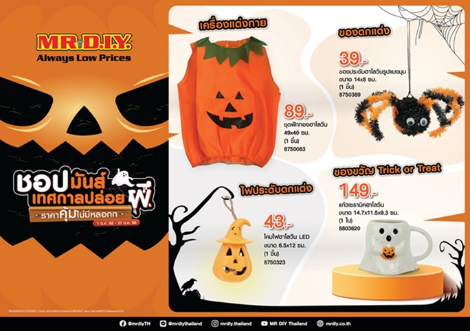 เพื่อร่วมเติมเต็มบรรยากาศแห่งความสนุกในปีนี้ มิสเตอร์. ดี.ไอ.วาย. ได้คัดสรรและขนทัพสินค้าไฮไลต์ฮาโลวีน “ชอปมันส์เทศกาลปล่อยผี ราคาคุ้มไม่มีหลอก”(1) กว่า 130 รายการ อาทิ ของประดับฮาโลวีนรูปแมงมุม ราคา 39 บาท โคมไฟฮาโลวีน LED ราคา 43 บาท ชุดฟักทองฮาโลวีน ราคา 89 บาท และแก้วเซรามิกฮาโลวีน ราคา 149 บาท ณ ร้านมิสเตอร์. ดี.ไอ.วาย. สาขาที่ร่วมรายการ(2) ซึ่งพร้อมมอบประสบการณ์ชอปปิงที่สะดวกสบายในราคาถูกคุ้มเสมอ (Always Low Prices) เพื่อให้ตอบโจทย์ทุกความต้องการของลูกค้าในการสร้างบรรยากาศฮาโลวีนได้อย่างเพลิดเพลินและสนุกกันได้เต็มที่”