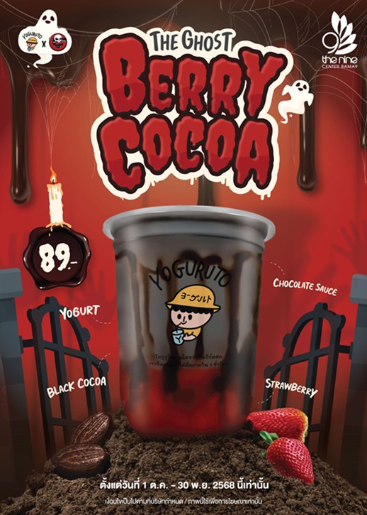 เดอะไนน์ เซ็นเตอร์ พระราม 9 ศูนย์การค้าในเครือ เอ็ม บี เค ชวนคุณมาหลอนรับเทศกาลฮาโลวีนกับเมนูพิเศษ The Ghost Berry Cocoa ที่อร่อยแบบขนลุก เมื่อ Yoguruto โยเกิร์ตสดปั่น คอลแลบกับ The Ghost Radio รายการผีสุดฮิต เมนูนี้รวมความลึกลับและความอร่อยไว้ด้วยกันอย่างลงตัว ความเข้มของดาร์กช็อกโกแลต ผสมกับความเปรี้ยวหวานของสตรอว์เบอร์รีและซอสช็อกโกแลต จนออกมาเป็นรสชาติที่น่าค้นหาและอร่อยจนวิญญาณหลุด
