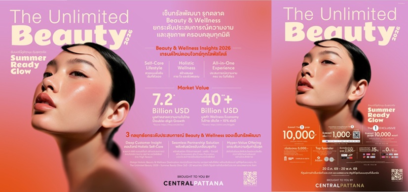 บริษัท เซ็นทรัลพัฒนา จำกัด (มหาชน)เดินหน้ารุกตลาด Beauty & Wellness กับแคมเปญ “The Unlimited Beauty 2026 – Summer Ready Glow” ชวนอัปเกรดลุคต้อนรับซัมเมอร์ 2569 เติมความมั่นใจ และดูดีที่สุดในแบบของตัวเอง  เดินหน้าปักหมุดศูนย์การค้าเซ็นทรัลทั่วประเทศสู่ “Holistic Beauty & Wellness Destination” ที่รวบรวมแบรนด์และบริการด้านความงามและสุขภาพชั้นนำกว่า 690 แบรนด์