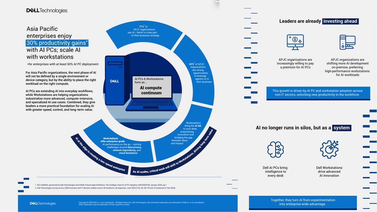 เดลล์ เทคโนโลยีส์ เปิดเผยข้อมูลสำคัญเกี่ยวกับการปรับตัวขององค์กรในภูมิภาคเอเชียแปซิฟิกที่กำลังเปลี่ยนผ่านจากการทดลองใช้งาน AI ไปสู่การนำมาใช้งานจริงในเชิงธุรกิจอย่างเต็มตัว โดยผลการศึกษาพบว่า 48% ขององค์กรขนาดใหญ่ที่มีพนักงานมากกว่า 500 คนได้เริ่มนำ AI PC เข้ามาเพิ่มประสิทธิภาพการทำงานแล้ว ขณะที่ 95% ขององค์กรเชื่อมั่นว่าเวิร์กสเตชันจะเป็นปัจจัยหลักที่ขับเคลื่อนโครงการ AI ให้ประสบความสำเร็จในช่วงสองปีข้างหน้า [2] การเปลี่ยนแปลงนี้สะท้อนให้เห็นถึงแนวโน้มการประมวลผลแบบกระจายศูนย์ที่ช่วยให้ระบบอัจฉริยะสามารถทำงานใกล้ชิดกับผู้ใช้งานได้มากขึ้น และเพิ่มความรวดเร็วในการตอบสนอง