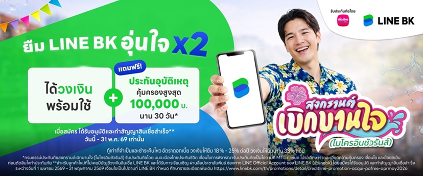 เมืองไทยประกันชีวิต ผนึกกำลัง LINE BK ส่งมอบ “กรมธรรม์ประกันภัยสงกรานต์เบิกบานใจ (ไมโครอินชัวรันส์)” ประกันภัยอุบัติเหตุกลุ่มที่ให้ความคุ้มครองครอบคลุมทั้งด้านชีวิตและค่ารักษาพยาบาล เนื่องจากอุบัติเหตุ สูงสุด 100,000 บาท นาน 30 วัน สำหรับลูกค้าที่สมัคร ได้รับอนุมัติ และทำสัญญาสินเชื่อใหม่กับ LINE BK รับสิทธิ์ ผ่านช่องทาง LINE BK Official Account  เริ่มตั้งแต่วันที่ 1 เมษายน 2569 –31 พฤษภาคม 2569