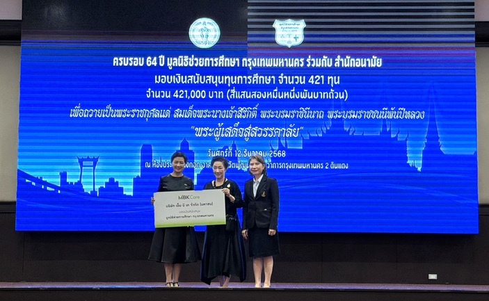 เอ็ม บี เค ร่วมส่งเสริมโอกาสทางการศึกษาอย่างต่อเนื่อง โดยเมื่อเร็ว ๆ นี้ คุณศตกมล วรกุล ผู้อำนวยการอาวุโส ฝ่ายสื่อสารองค์กร บริษัท อินเทลลิเจ้นท์ ครีเอทีฟ แอนด์ มาร์เก็ตติ้ง จำกัด (ที่ 1 จากซ้าย)  เป็นตัวแทนมอบเงินสนับสนุนมูลนิธิช่วยการศึกษา กรุงเทพมหานคร ถวายเป็นพระราชกุศล เฉลิมพระเกียรติสมเด็จพระนางเจ้าสิริกิติ์พระบรมราชินีนาถ พระบรมราชชนนีพันปีหลวง จำนวน 50,000 บาท