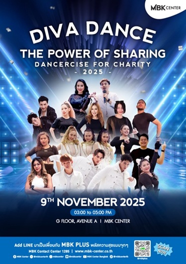 กลับมาอีกครั้งกับพลังแห่งการแบ่งปัน!! ศูนย์การค้า เอ็ม บี เค เซ็นเตอร์ ร่วมกับกลุ่มเต้นออกกำลังกายที่รวมพลังสร้างสรรค์เพื่อสังคมอย่างต่อเนื่อง The Diva Thailand ชวนรวมพลังแห่งการให้ ร่วมเต้นด้วยหัวใจ ส่งต่อรอยยิ้มให้สังคมและสุขภาพดีไปด้วยกันกับบทเพลงไทยในความทรงจำในกิจกรรม The Power of Sharing Dancercise for Charity 2025 กับครูสอนเต้นจากทั่วประเทศ