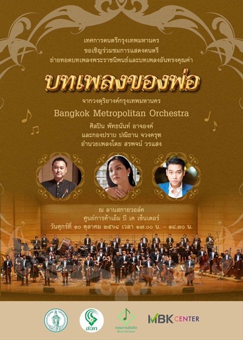เพื่อให้ประชาชนได้รับฟังบทเพลงพระราชนิพนธ์อันแสดงถึงพระปรีชาสามารถขององค์อัครศิลปินของไทย และพระมหากรุณาธิคุณของพระองค์ท่านที่มีต่อวงการเพลงไทย โดยการบรรเลงของ วงซิมโฟนีออเคสตรา Bangkok Metropolitan Orchestra วงดุริยางค์กรุงเทพมหานคร อำนวยเพลงโดย สรพจน์ วรแสง พร้อมด้วยศิลปินรับเชิญ พัทธนันท์ อาจองค์ และ กองปราบ ปณิธาน จวงครุฑ ในวันศุกร์ที่ 10 ตุลาคม 2568 ตั้งแต่เวลา 17.00 น. – 18.30 น. บริเวณลานสกาย วอล์ค ชั้น 2 ศูนย์การค้าเอ็ม บี เค เซ็นเตอร์