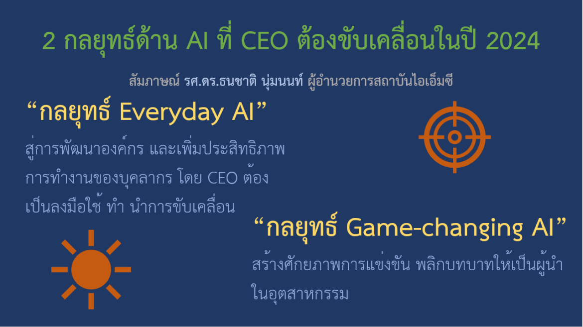 รศ.ดร.ธนชาติ นุ่มนนท์ ผู้อำนวยการสถาบันไอเอ็มซี ได้ให้สัมภาษณ์กับเว็บไซต์ The-perspective ถึง สิ่งที่ CEO จะต้องเตรียมความพร้อมให้กับองค์กรในปี 2024 นี้ ซึ่งท่านฟันธงว่า AI เป็นประเด็นที่สำคัญที่สุด โดยมองว่า ถึงเวลาแล้วที่ CEO ควรต้องยอมรับว่า AI เป็นสิ่งจำเป็นเชิงกลยุทธ์มากกว่าเป็นเพียงเครื่องมือทางเทคโนโลยีที่เพิ่มประสิทธิภาพการดำเนินงาน แต่ยิ่งกว่านั้นคือ AI มีศักยภาพในการกำหนดรูปแบบธุรกิจใหม่ และขับเคลื่อนนวัตกรรมทั่วทั้งองค์กร ดังนั้นองค์กรในปี 2024 นี้ควรจะต้องกำหนดกลยุทธ์ด้าน AI โดยมี CEO เป็นผู้นำ