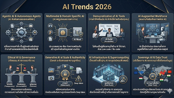 • 1. Agentic AI & Autonomous Agents (AI ผู้ช่วยระดับสูง): เปลี่ยนจาก AI ตอบโต้ เป็นระบบที่คิด วางแผนกลยุทธ์ และทำงานข้ามแพลตฟอร์มได้อัตโนมัติ