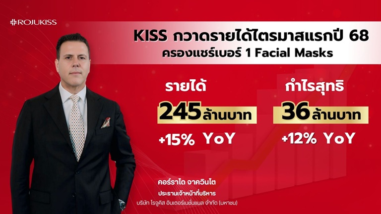 คุณคอร์ราโด จาควินโต ประธานเจ้าหน้าที่บริหาร บริษัท โรจูคิส อินเตอร์เนชั่นแนล จำกัด (มหาชน) หรือ KISS เปิดเผยว่า ผลการดำเนินงานในไตรมาสแรกของปี 2568 บริษัทมีรายได้อยู่ที่ 245 ล้านบาท เพิ่มขึ้น 15% และมีกำไรสุทธิอยู่ที่ 36 ล้านบาท เพิ่มขึ้น 12% จากช่วงเดียวกันปีก่อน