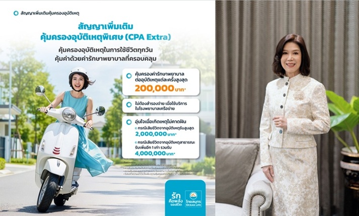 ด้วยความเข้าใจถึงความกังวลใจของลูกค้า OCEAN LIFE ไทยสมุทร จึงขอนำเสนอ สัญญาเพิ่มเติมคุ้มครองอุบัติเหตุพิเศษ (CPA Extra)* ซึ่งเป็นสัญญาเพิ่มเติมใหม่ที่ออกแบบมาเพื่อช่วยแบ่งเบาภาระค่ารักษาพยาบาลจากอุบัติเหตุ และมอบความคุ้มครองที่ครอบคลุมยิ่งขึ้นหากประสบอุบัติเหตุสาธารณะ เพื่อให้คุณและครอบครัวสามารถใช้ชีวิตได้อย่างมั่นใจในทุกวัน