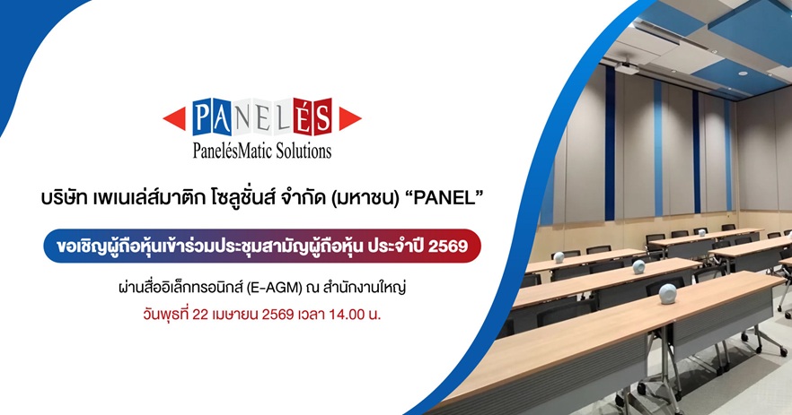 บมจ.เพเนเล่ส์มาติก โซลูชั่นส์ (PANEL) ผู้นำระบบประตูห้องผ่าตัด ประตูอัตโนมัติ ผนังบานเลื่อนกันเสียง และห้องเก็บเสียงเคลื่อนที่ เตรียมพร้อมสำหรับการจัดการประชุมสามัญผู้ถือหุ้นประจำปี 2569ในรูปแบบ E-AGM ผ่านระบบออนไลน์ในวันที่ 22 เม.ย.นี้