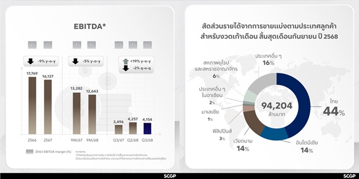 ในไตรมาส 3 ปี 2568 SCGP มีรายได้จากการขายรวม 30,438 ล้านบาท ลดลง 9% เมื่อเทียบกับปีก่อน และลดลง 4% จากไตรมาสก่อน ขณะที่ EBITDA อยู่ที่ 4,154 ล้านบาท เพิ่มขึ้น 19% จากปีก่อน แม้ลดลง 2% จากไตรมาสก่อน ส่วนกำไรสุทธิ 953 ล้านบาท เพิ่มขึ้นถึง 65% จากปีก่อนหน้า โดยได้รับแรงหนุนจากผลประกอบการของธุรกิจบรรจุภัณฑ์กระดาษในอินโดนีเซียที่ปรับตัวดีขึ้น