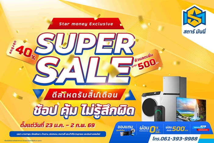 บมจ.สตาร์ มันนี่ (STARM) จัดโปรฯ แรงรับต้นปีกับแคมเปญ “Star Money Exclusive Super Sale 2026” บอกเลยว่าช้อปเพลินจนไม่ต้องรู้สึกผิด เพราะคุ้มเกินต้าน…งานนี้เอ็มดีคนเก่ง “ชูศักดิ์ วิวัฒน์วงศ์เกษม” ใจใหญ่จัดเต็ม ยกขบวนเครื่องใช้ไฟฟ้าแบรนด์ดังมาลดสูงสุด 40% ยังไม่พอ.. มีส่วนลดเพิ่มให้อีกสูงสุด 500 บาท* พร้อมของแถมพรีเมียมสำหรับรุ่นที่ร่วมรายการ เริ่ม 23 ม.ค.-2 ก.พ. 2569 เฉพาะสาขาที่ร่วมรายการ และลูกค้าภาคตะวันออกช้อปที่บ้านได้สบายๆ เพราะสามารถทำสัญญาผ่อนผ่านทางออนไลน์ได้…ใครเล็งตู้เย็นใหม่ ทีวีจอใหญ่ หรือเครื่องใช้ไฟฟ้าเข้าบ้าน จังหวะนี้ห้ามพลาด! โปรฯ ดีแบบนี้เตรียมรับทรัพย์รัวๆ ได้เลยคร้า!!