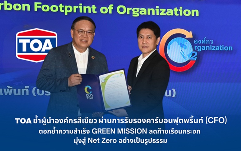 บริษัท ทีโอเอ เพ้นท์ (ประเทศไทย) จำกัด (มหาชน) หรือ TOA ผู้นำอุตสาหกรรมสีอันดับ 1 เคมีภัณฑ์ก่อสร้าง และวัสดุตกแต่งพื้นผิวของไทย ตอกย้ำความสำเร็จอย่างต่อเนื่องในการดำเนินธุรกิจควบคู่กับการดูแลสิ่งแวดล้อม เดินหน้าองค์กร Net Zero อย่างเป็นรูปธรรม ล่าสุดได้รับประกาศนียบัตร ‘การรับรองคาร์บอนฟุตพริ้นท์ขององค์กร (Carbon Footprint for Organization: CFO)’