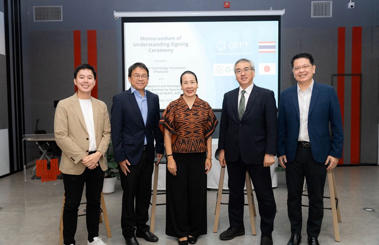 ดร.จิรวัฒน์ ตั้งปณิธานนท์ ประธานเจ้าหน้าที่บริหารและผู้ร่วมก่อตั้ง บริษัท Quantum Technology Foundation (Thailand) Co., Ltd. (QTFT) (ซ้าย) และ ศาสตราจารย์ มาซุ คาซูยะ ผู้อำนวยการศูนย์ G-QuAT สถาบันเทคโนโลยีอุตสาหกรรมขั้นสูงแห่งชาติ (AIST) ประเทศญี่ปุ่น (ขวา) ได้ลงนามในบันทึกความเข้าใจ (MOU)